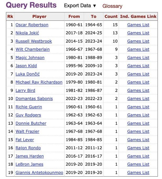 据统计,这是约基奇生涯第14场比赛至少15分15板15助攻,历史第2多,距离历史纪录保持者大O仅差1次。